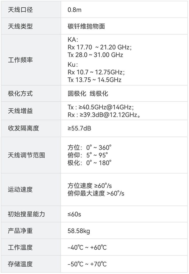 3.独创的对星算法和一流的伺服控制系统,确保快速精确对星;单人从开箱到天线对准卫星只需4分钟,无需任何工具;模块化安装,物理损坏可更换;
