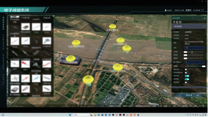 系统支持军事行动图标标绘功能,内含各类军事标绘千余种,通过拖拽即可开始添加标绘,同时可自定义军事图标导入模型库,支持对图标标绘的尺寸、颜色等参数调节,具备协同标绘功能,在各节点标绘后可在其他节点设备中共享数据。