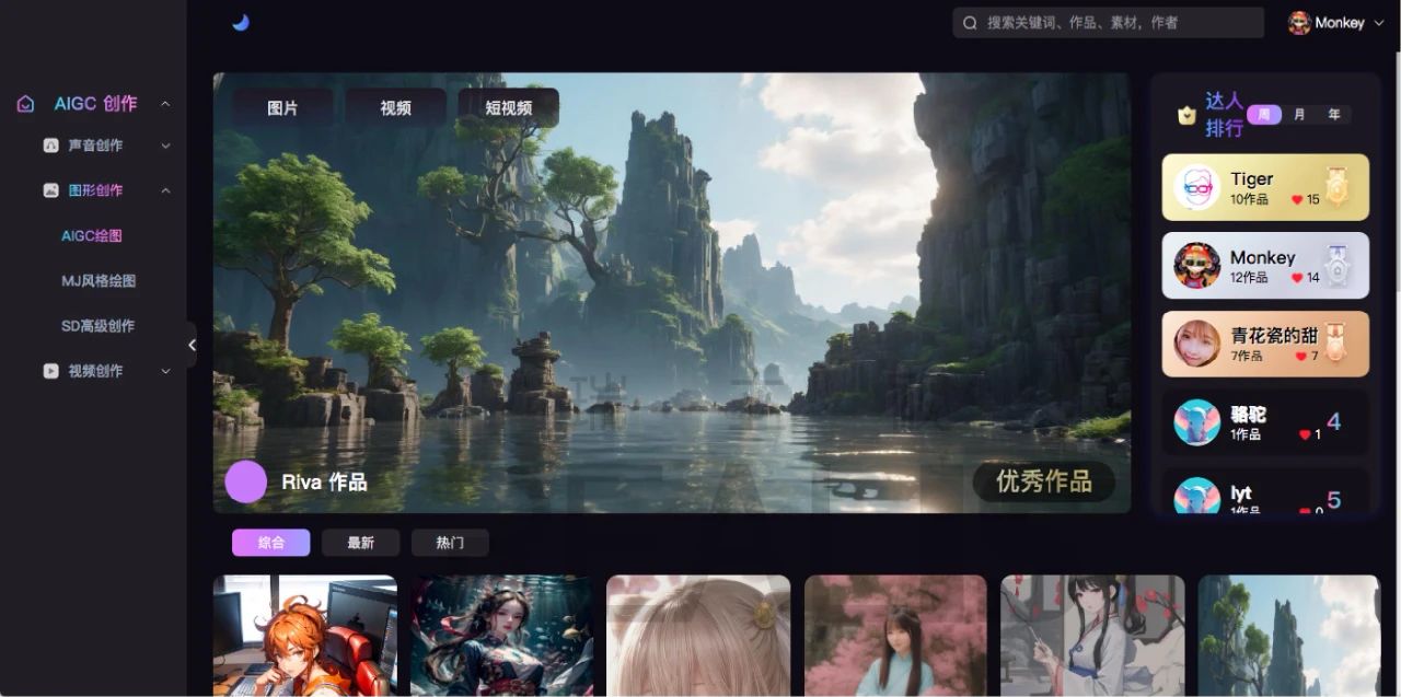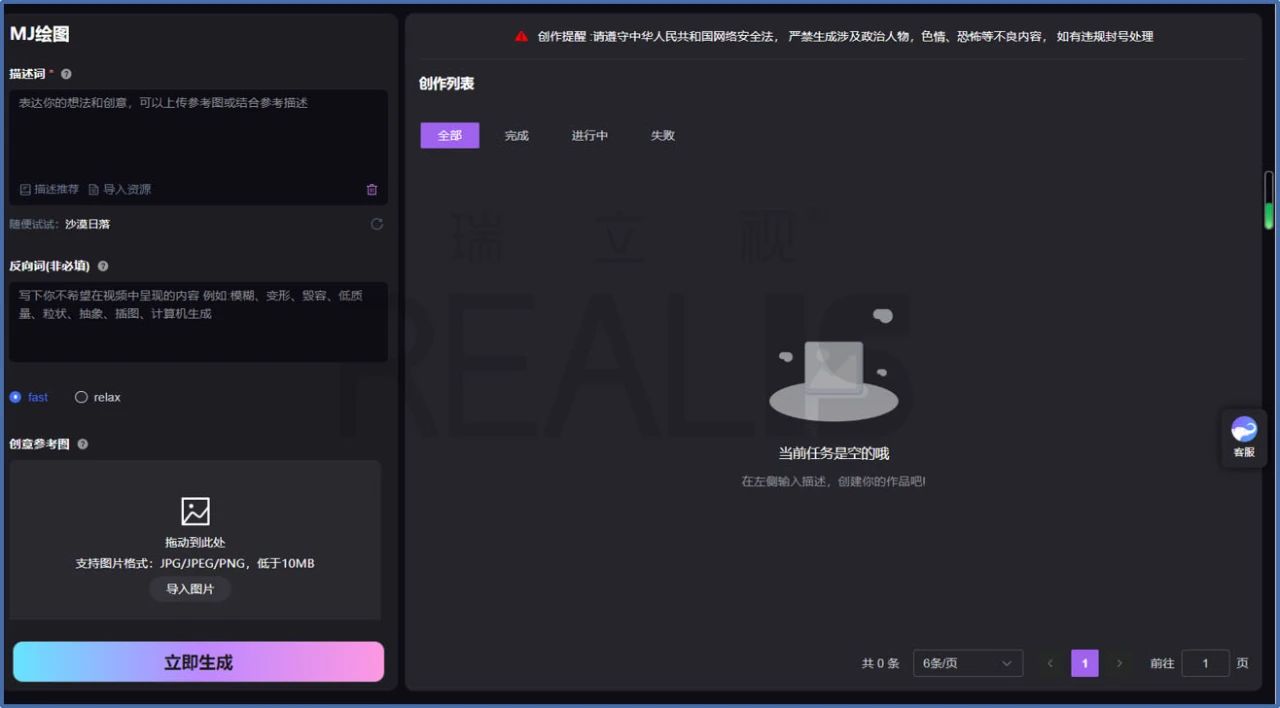 支持AI绘图一键生成功能,覆盖MJ与SD等多种风格,用户仅需输入简单描述或上传图片,即可迅速获得定制化的图像,无论是卡通、写实还是抽象风格,皆能轻松驾驭。此外,通过导入推荐词资源和反向词功能,用户可以进一步细化生成内容,满足不同场景的需求。图片尺寸的自由设定、快速与慢速生成模式的切换,以及JPG、PEG、PNG等多种格式的支持,进一步提升了生成的灵活性与便捷性。在音频领域,基于文本风格与情境,平台能自动生成高质量对话配音及背景音乐/歌曲,为作品注入灵魂。