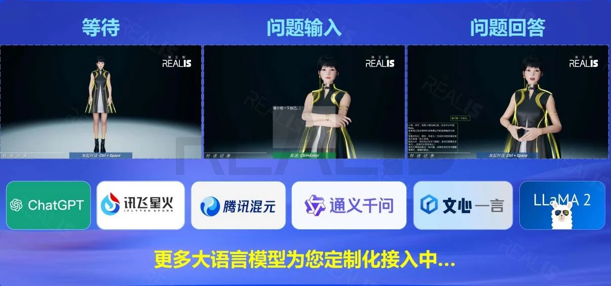 支持接入市面上主流的大语言模型,如ChatGPT、讯飞星火等,同时提供定制化接入服务,结合知识图谱技术,使数字人能够深入理解用户对话内容,识别情感与意图,模拟人类真实语言习惯,实现更贴近自然的交流。通过机器学习,数字人的语言能力能够自我提升,自动迭代优化,满足多样化场景下的定制需求。