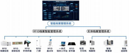 智能档案管理系统是以实体档案管理设备为核心,通过先进的RFID技术实现对档案架上档案的高效、安全管理。实现无序存放、有序管理、自动盘点、自动出入库记录等。系统整体组成包括RFID档案智能管理系统、实体档案管理系统,如下图所示: