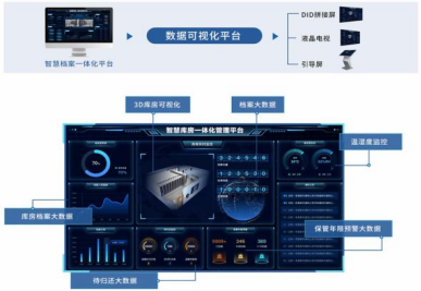数据可视化平台可将智慧档案室内的各类数据实时显示,化繁为简,赋能档案室设备管理自动管理,档案管理高效化。将传统枯燥的档案数据变为直观清晰的大数据进行展示,对海量数据进行实时、全程、全面的检测。并且DID拼接屏(液晶电视、引导屏)可上墙展示,档案室效果尽显美观、大气。
