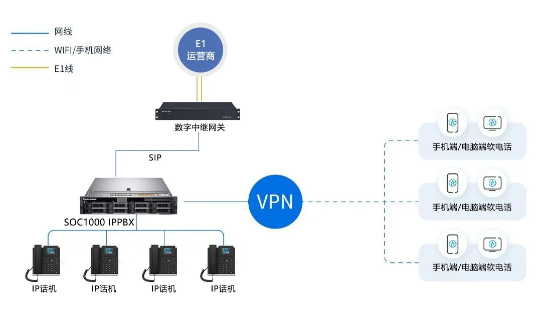 4、在手机和电脑上安装软电话应用,通过WIFI或移动网络注册为IPPBX的分机,实现灵活通信。