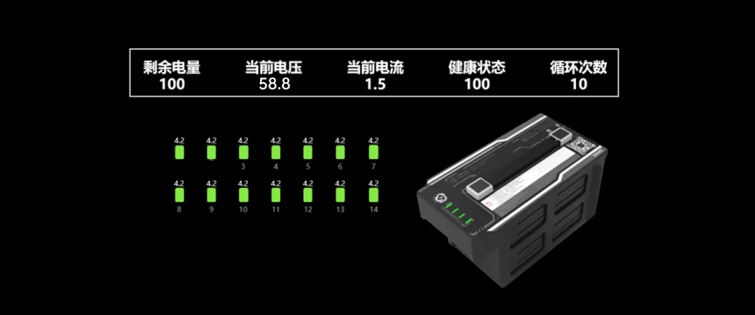QP530A使用14S高能量密度智能电池2,单节电芯放电区间较常规电池更大(3.0V~4.2V,常规电池3.6~4.2),能量密度得到大幅提升,续航更持久。