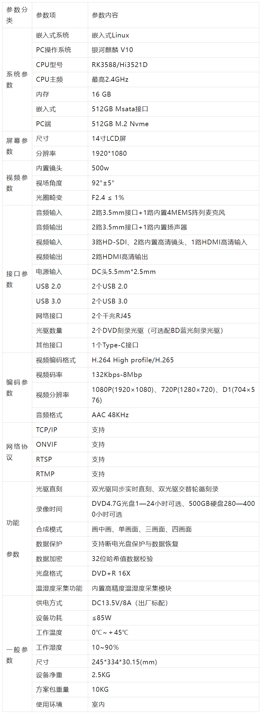 采用嵌入式Linux+银河麒麟V10双系统操作,超薄设备计,内置智能语音识别系统,设备内置3个1080P高清摄像头、内置4MEMS阵列麦,支持双角色分离和远距离拾音阵列麦克风,集双光盘刻录、视频显示、硬盘备份、网络传输等功能于一体,安全稳定。