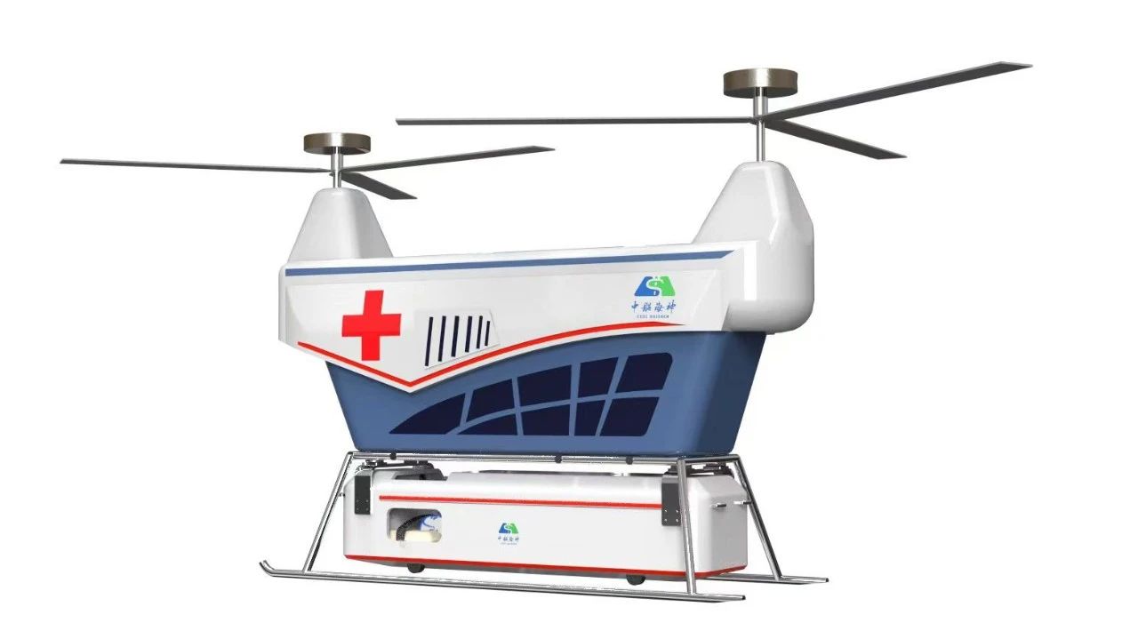 “急救转运无人机”, 具有“呼吸、液体输注、体征监护、除颤、超声、复温、供氧和感控,以及环境监测和远程视频监控”等多种医学救治功能;具备“在潮湿、盐雾、颠簸和6级海况的海上,以及在-25°C至46°C、海拔5000米的高原,能有效对海上和高原遇险受灾人员,进行精准搜救、现场急救、伤病员快速转运后送、救援物资及时投放”等救治能力;拥有航线跟踪、悬停等自主飞行功能,也可通过地面站遥控飞行,起飞自重为600公斤、载重为300公斤,能广泛应用于“战时、传染病防控、极端自然灾害和突发事件”等多场景危重症伤病员的救治及后送。通过与海上和高原应急医学救援智能管理系统的有效兼容,构建了“现场、近处和后送”救治与保障的“两条链”,无缝衔接了“搜和救”两个领域的“一条线”。