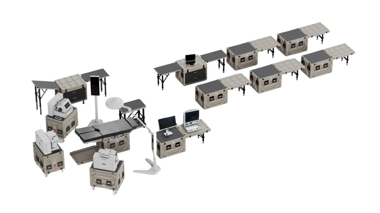“智成医疗救治箱组”,集成二级医院所需的“指挥通信、急救、手术、医技保障、供应保障和特需救治”6个模块,具备“智能化、系统化、模块化、高机动和多功能”等特点;能做到在20分钟内快速展开和撤收,实现“开箱即用、合箱即走”;能广泛应用于“战场批量伤员救治、自然灾害救援、事故灾难救援、公共卫生应急和国际人道主义救援”等多种场景下临时医院、半永久医院的开设,有效解决传统医疗装备品类繁多展开难、携行不便机动难、复杂环境适应难、要素不全救治难、信息多类共享难等问题。