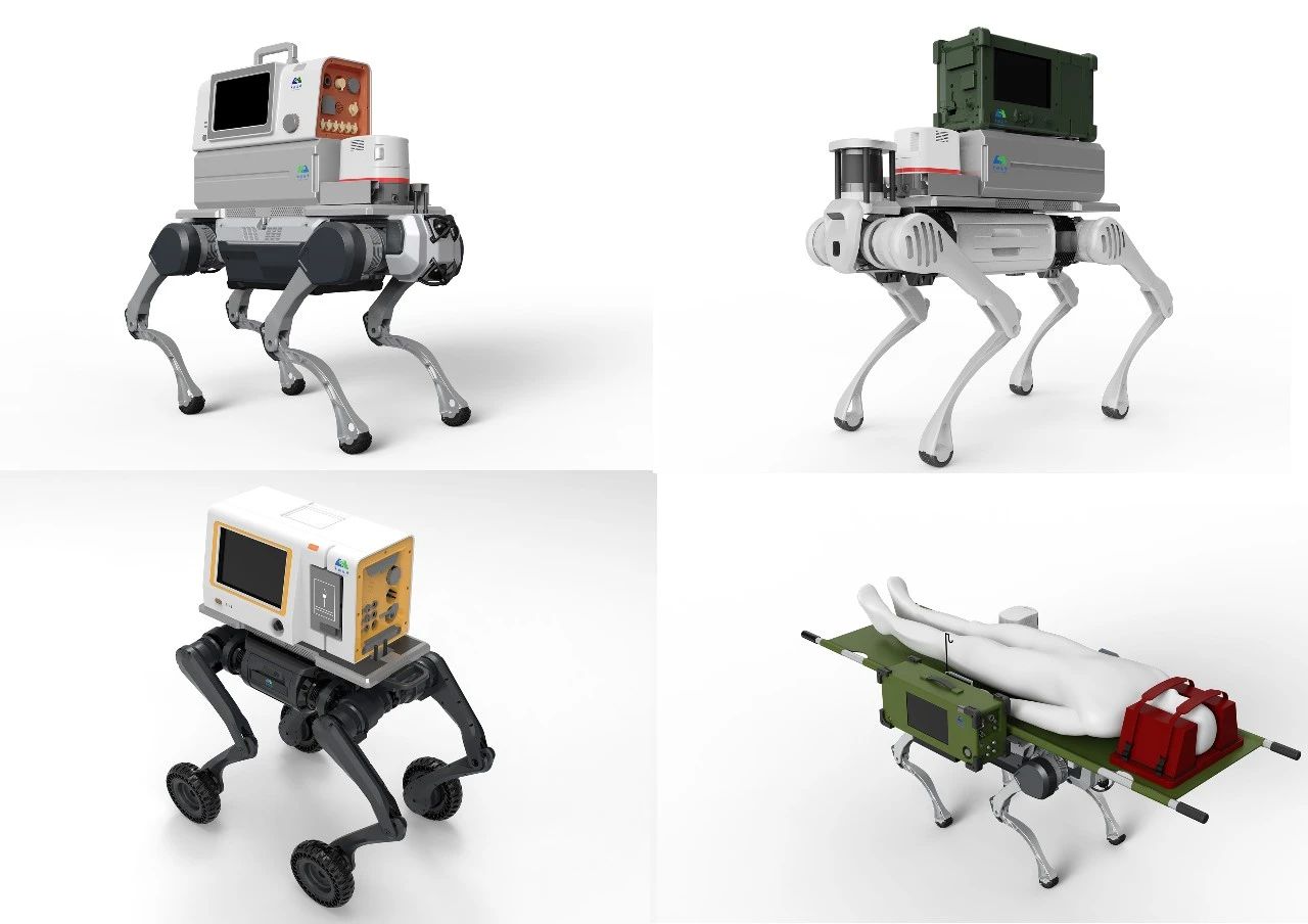 “急救(转运)机器人”,选配“四足、四轮和履带”三种“行走方式”,具有“行走、奔跑、爬楼、爬坡、趴下、避障和越障”七大能力;具备“呼吸、监护、输液、超声、除颤、心肺复苏和供氧”七大功能;能在-20°C至55°C环境稳定运行,自动精准地对伤员实施“动中急救”,能广泛应用于自然灾害救援、复杂环境作业、安全事故救援、战场急救和院前院内转运等多种场景。