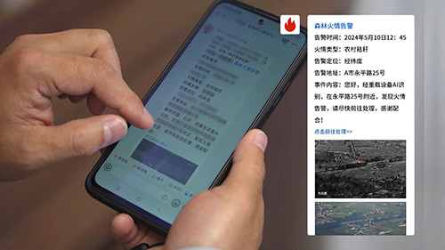 24小时、365天全年无休的森林天眼无死角智能巡航,一旦发现异常高温火点立即报警,告警时间、火情类型、火点定位经纬度信息、热成像、可见光报警图片等报警信息会通过智能助理推送到值班人员的手机上。