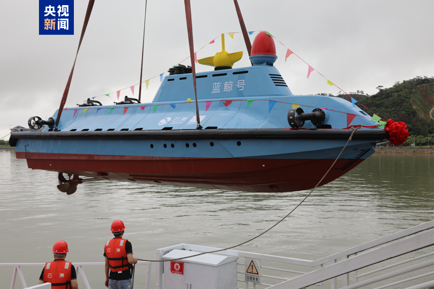 随着吊机缓缓下探,全长11米、排水量12吨的“蓝鲸号”可潜无人艇稳稳落入水中,标志着全球首艘高速可潜无人艇研制成功。