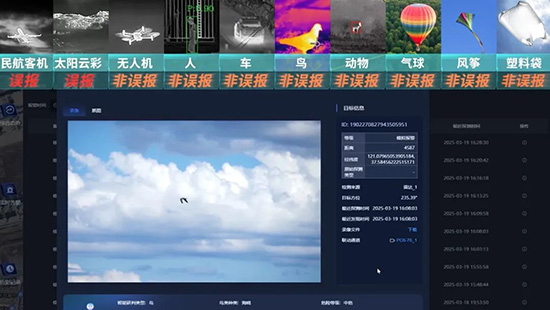 搭配自研的立体防控平台,深度融合DeepSeek的新一代AI大模型,可解析报警图像视频,识别出无人机、鸟、动物、气球、风筝等多种目标类型,研判过滤民航客机、云彩、太阳光等误报目标。