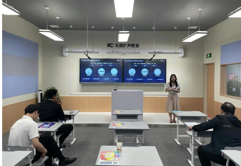 无感扩声教室展示区,重点了展示itc无感扩声系统。系统采用5A音频算法处理、分组闪避扩声技术,6米拾音+AI降噪,只需在讲台中央布置吊麦,老师就能解放双手,轻松发言扩声,打破传统教室扩声方式,让老师更加专注课堂教学,实现声场均匀覆盖、音质清晰自然,老师授课达到无体感佩戴效果。