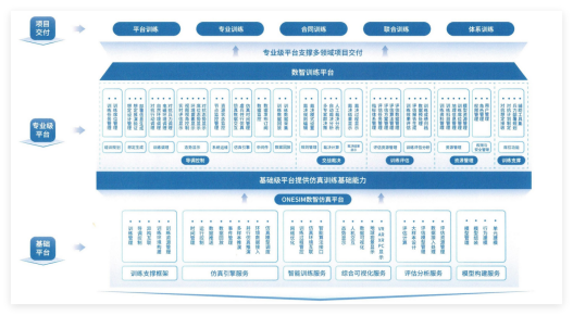 在面向部队多样化的业务需求某司提供基础平台和专业级平台两类产品。基础平台为面向仿真试验的ONESIM数智仿真平台,以智能体建模仿真、数字孪生、LVC等技术为基础,以自主研发及国产化的技术优势,通过高精度环境构建渲染、体系化全要素建模仿真、多维度数据分析以及智能体训练学习等能力,为数智试验论证等领域应用提供技术底座支撑。专业级平台为面向模拟训练的数智训练平台,以ONESIM基础平台为底座,通过多系统联合运行、LVC全要素集成、海量实体调度管理、智能裁决评估等能力支撑导、训、裁、评、管等训练领域的全方位需求。