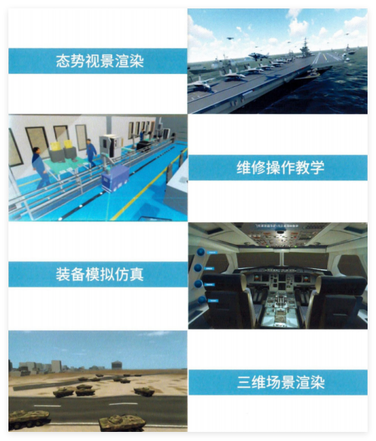 二三维虚拟场景快速构建、基于数字地球的一镜到底场景显示与漫游、基于VR/AR/XR的沉浸式显示与人机交互控制、仿真/实装数据驱动二三维综合态势显示、国内外主流装备/人员多分辨率精细三维模型库、陆海空天典型战场环境场景模型库、手柄/眼动/语音/手势/动作等多模态交互。