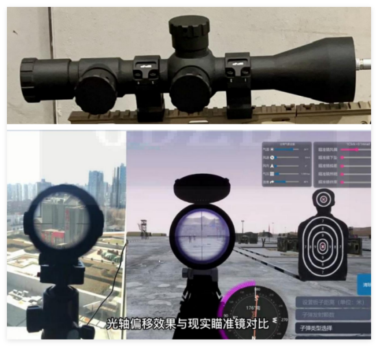 可通过内置在道具内的传感器获取光学瞄准镜仿真道具上各个调节手轮的转动传感数据,用于驱动虚拟现实内容中的光学瞄准镜上各个调节手轮的转动数值,实现在虚拟现实环境中1:1还原通过转动调节瞄准镜上的手轮,控制瞄准镜分划线移动来修正弹道或其他相关功能;