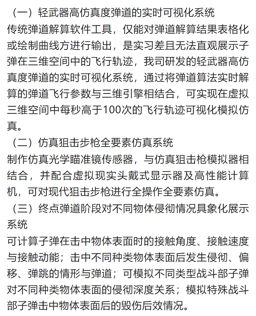 狙击模拟训练系统,采用虚拟现实半实物仿真方案,能够准确模拟真实狙击武器的操作使用和弹道轨迹,同时对训练场地和时长几乎无限制,对武器装备零损耗,对参训人员绝对安全,还能够在虚拟环境中实现比传统靶场射击更贴近实战化的战场环境射击模拟。