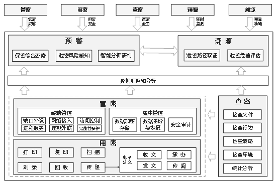 本方案依据军队计算机及信息系统安全保密防护的相关政策标准要求,针对数据内容及其涉密属性,构建了“管密、用密、查密、预警、溯源”的智能化防护监测体系。管密环节采用终端综合管控与审计机制,确保各项保密措施得以规范执行。用密环节对打印、复印、扫描、刻录、回收、传递等六个关键环节实施严格管控,以保证用密过程的安全性。查密环节对数据的生成、使用、流转等各阶段及电磁环境进行全面检查,确保查密工作的系统、高效。预警环节通过数据的汇集与分析,准确感知潜在的泄密风险,对隐患进行分析研判,确保系统的智能监测功能得以有效发挥。溯源环节则对泄密风险的路径进行全面的证据收集,评估泄露所造成的危害,并联动相关部门进行处置,确保泄密事件的追溯准确无误。