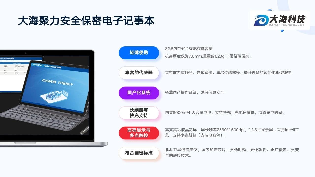 配合大海聚力无纸化会议系统,通过国密算法加密预装调研资料至平板,实现一人一本、随“机”应变,助力“碳达峰、碳中和”,有效解决党政机关、企事业单位用户召开内部敏感会议的无纸化需求。保护敏感数据不被泄露,减少纸质流转、会议沟通时间,支持离线环境安全查阅与编辑,打破地域限制,提高流转效率,让您无忧办公。
