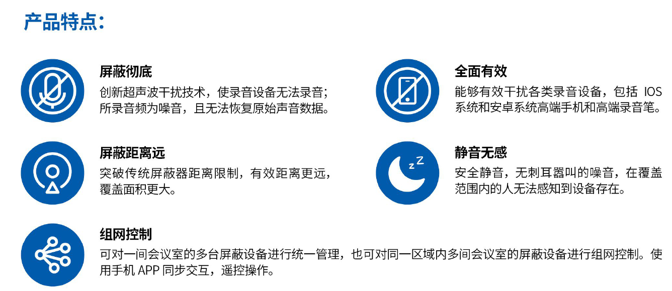 智信天一ZXTYSD-300 录音屏蔽系统是一款基于超声波干扰技术,针对各类谈话场景,集合多种屏蔽设备和控制系统,以实现对谈话空间全面保护的录音干扰屏蔽系统。产品包含: SD-305桌下型录音屏蔽器、SD-308 挂墙式录音屏蔽器、SD-309桌面型录音屏蔽器以及 SD-301录音屏蔽系统控制终端,既可支持单机工作,又可实现统一管控,方便大规模部署及后台管理,适用于各类商业集团、保密单位的机密会议、会谈等场景。可有效防范在商业谈判、重要工作交流过程中的非正常录音,保护使用者的谈话信息和商业秘密安全。