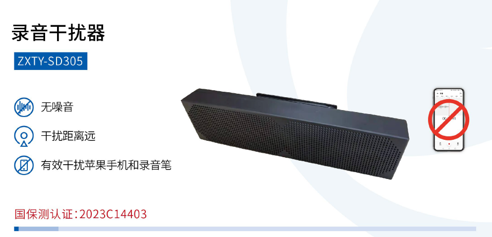 1、ZXTY-SD305 型录音屏蔽器是一款基于超声波干扰技术的防录音设备。设备通过产生超声波实现对覆盖范围内各种录音设备的干扰,使其无法正常录音,录到的是噪音,并且无法恢复原始声音数据。ZXTYSD305 是一款桌下型安装形态的设备,主要覆盖桌面以下的空间,确保此范围内的录音设备无法正常录音。设备可支持角度调节,安装于桌下,可根据被干扰目标位置调节角度,实现更好的屏蔽效果。