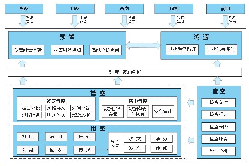 本方案依据军队计算机及信息系统安全保密防护的相关政策标准要求,针对数据内容及其涉密属性,构建了“管密、用密、查密、预警、溯源”的智能化防护监测体系。管密环节采用终端综合管控与审计机制,确保各项保密措施得以规范执行。用密环节对打印、复印、扫描、刻录、回收、传递等六个关键环节实施严格管控,以保证用密过程的安全性。查密环节对数据的生成、使用、流转等各阶段及电磁环境进行全面检查,确保查密工作的系统、高效。预警环节通过数据的汇集与分析,准确感知潜在的泄密风险,对隐患进行分析研判,确保系统的智能监测功能得以有效发挥。溯源环节则对泄密风险的路径进行全面的证据收集,评估泄露所造成的危害,并联动相关部门进行处置,确保泄密事件的追溯准确无误。
