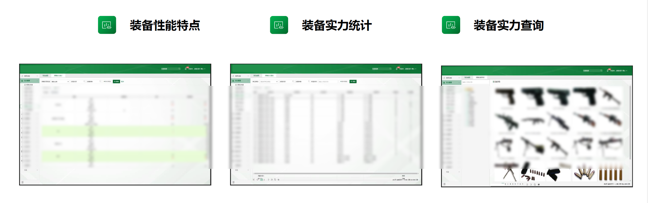 “实力管理”功能模块,通过“图+表”的形式进行可视化展现,包括“装备性能特点”、“装备实力查询”、“装备实力统计”等内容。