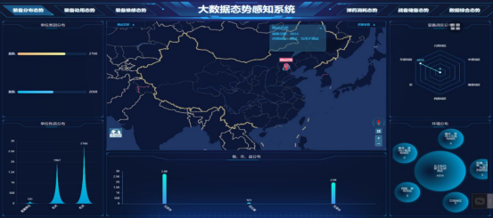 利用大数据技术整合挖掘各类静态和动态装备数据资源,结合地图及图形化显示工具,实现装备发展状态的监测、预测、推演、为决策提供支持。