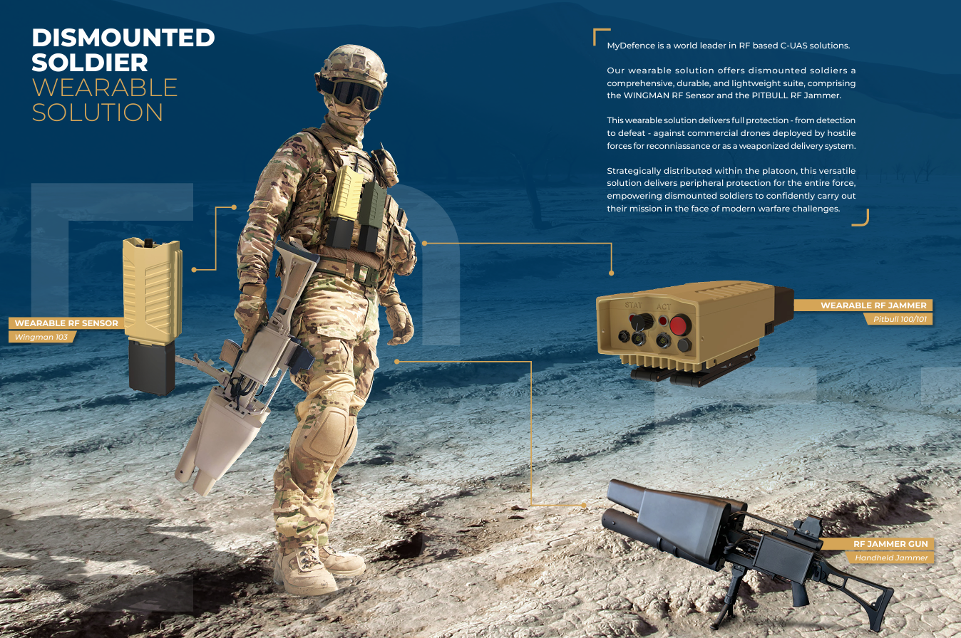 新签约的国防产品,MyDefence的士兵套件,将轻型“僚机”无人机探测器和“斗犬”干扰机集成到一个1.3公斤重的可穿戴系统中,可以谨慎地连接到战术装备上。