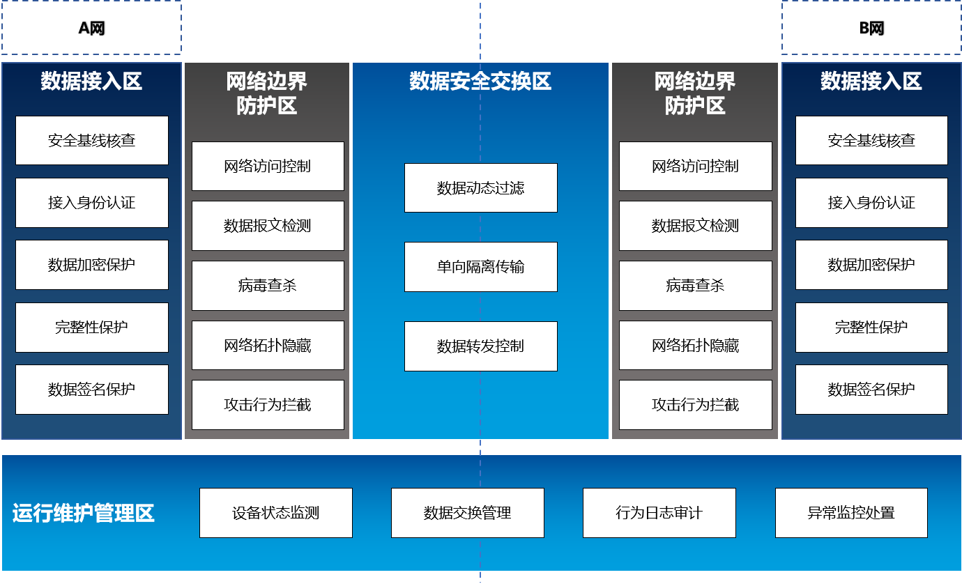 跨网跨域数据安全交换解决方案,整体设计包括数据接入区、网络边界防护区、数据安全交换区、运行维护管理区,通过在业务系统中部署应用代理或提供API等方式为数据交换实体提供跨网跨域数据交换服务,综合运用权限管控、数据采集、边界防护、数据动态过滤、运行维护管控等技术手段,构建贯穿跨网跨域数据交换全链路的纵深防御体系,如下图所示: