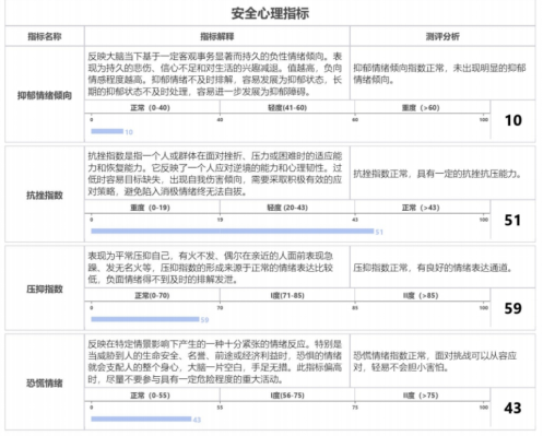 其中“脑生理”数据可反应被测人的部分生理健康状态;“抗挫指数”过低自我伤害风险;“行为强势”指数过高有出现欺凌行为的风险等。