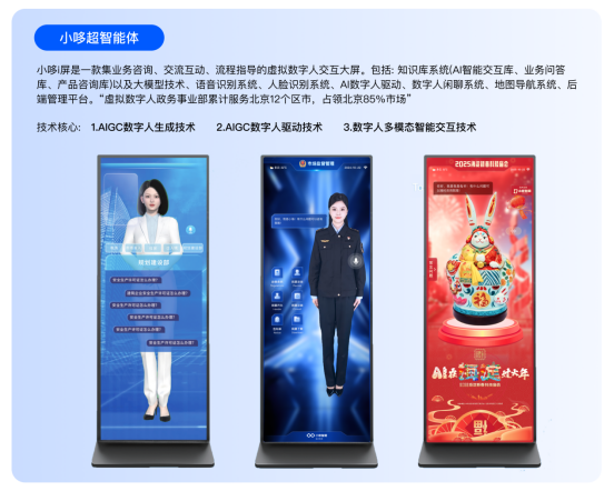 凭借小哆睿问行业大模型(生成式人工智能服务备案),推出多模态AIGC创新产品,如小哆i屏、小哆i播、小哆i教、小哆创镜等。产品应用于多个领域,在政务与教育市场领先,获众多顶尖客户青睐,成为多模态数字人战略首选伙伴。