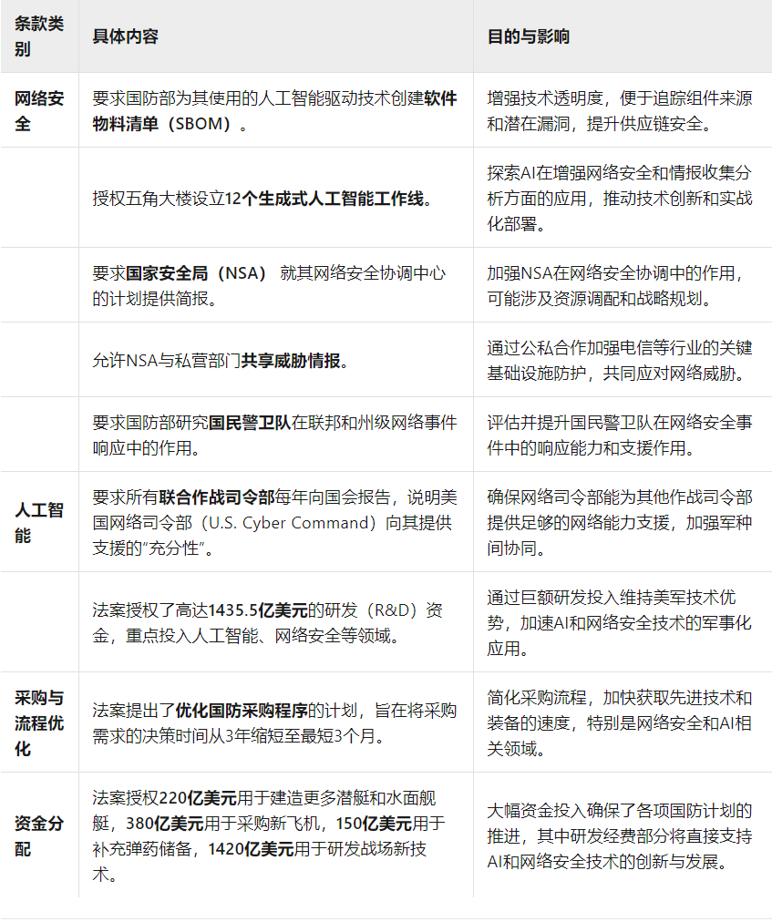 • 技术领先与大国竞争:法案中大幅增加的研发投入,特别是在AI和网络安全领域,旨在确保美国在面对其所谓的“战略竞争对手”(如中国)时能保持技术优势。
