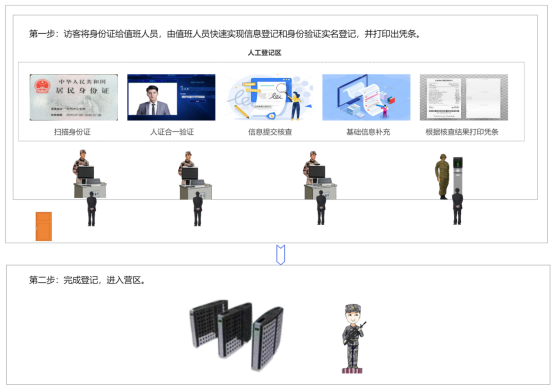访客将证件提交给值班员,配合完成信息登记,具体步骤包含:扫描身份证、人脸拍照、人证核验、填写个人信息、值班员确认核验结果、完成登记等待凭条打印。