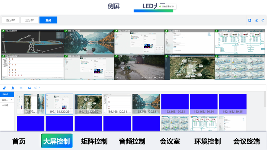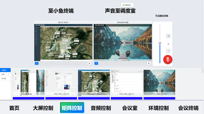 为减少值守人员在多设备间切换的操作成本,在协同过程中,值守人员不再受设备形态限制,并可通过可视化菜单能在多屏与多设备间顺畅切换,关键画面可直接推送至大屏或相邻席位,必要时还能快速接管控制权,领导席位关注的视图也能与指挥席保持信息同频,大幅提升决策效率。中控系统进一步整合了灯光、空调、窗帘及视频会议设备,场景切换无需在多个系统间来回操作,实现显控与环境设备的同节奏联动。