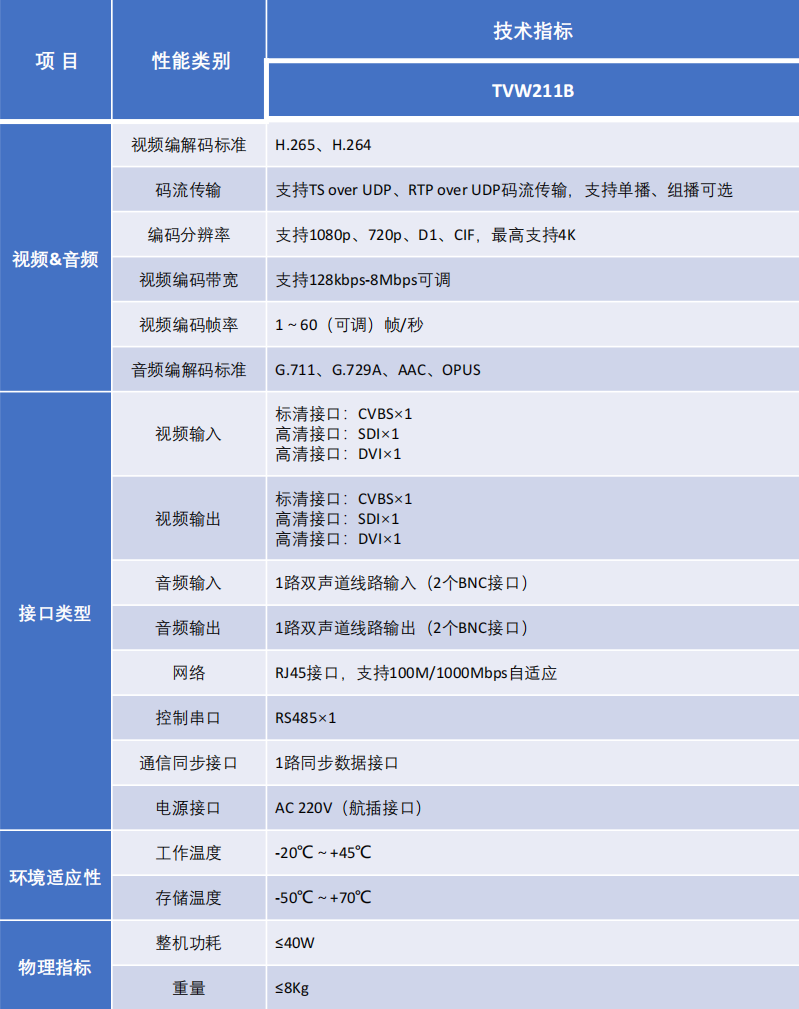 TVW211B型高清视频编解码器是一款基于卫星通信信道特性自主研发音视频编解码终端,具备高清音视频编解码传输功能。该产品遵循相关视频传输标准设计,能够与符合标准的现役设备互联互通,产品采用H.264、H.265视频编解码技术和自主研发的带宽自适应策略,能够满足128Kbp至8Mbps带宽范围内清晰流畅的音视频交互需求。
