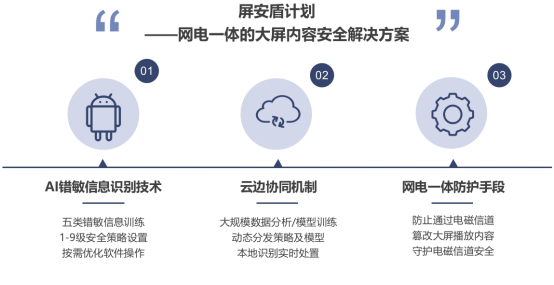 “屏安盾”解决方案是立鑫科技基于一个“网电一体” 的综合防护体系研发的,旨在打造从源头到播放全链路保障大屏内容安全。