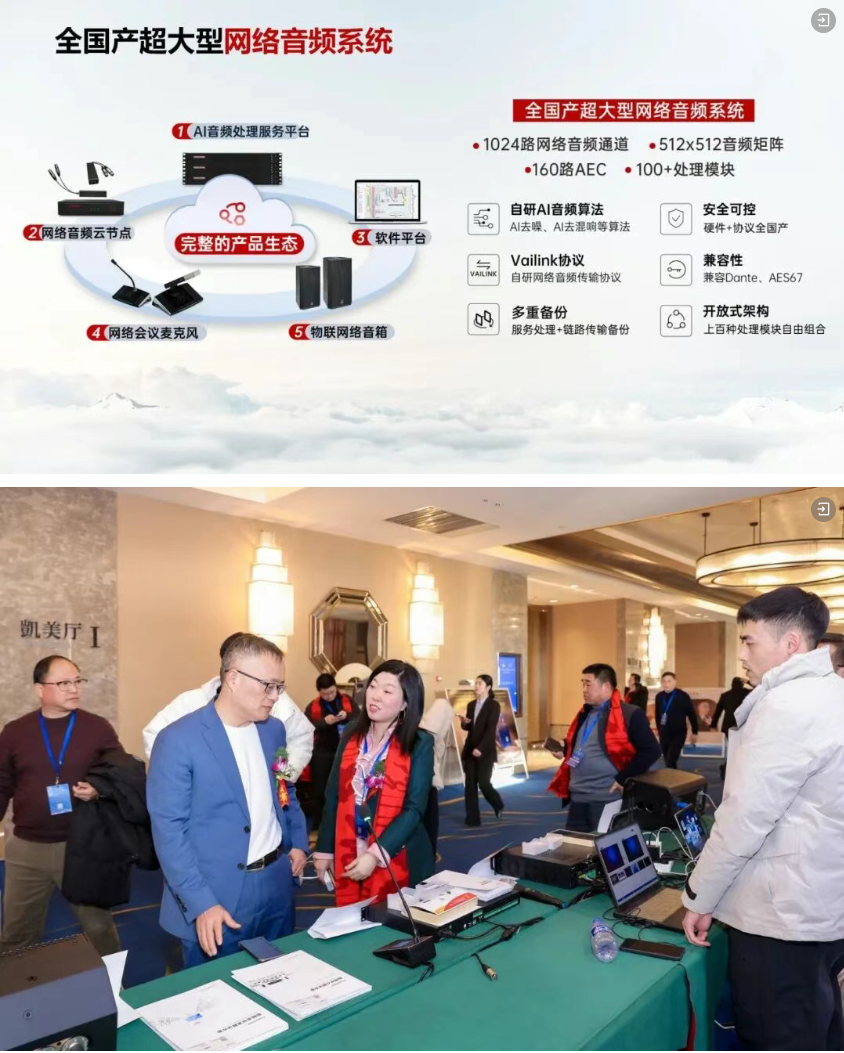 年会特设的创新成果展区中,东微智能携多款核心产品亮相,成为全场焦点。Amber全国产超大型分布式网络音频系统、AGATE系列AI网络音频处理器以及Climber超融合多功能终端等产品吸引众多来宾驻足交流。现场互动频繁,气氛热烈,充分体现了市场对东微智能产品与解决方案的高度认可。