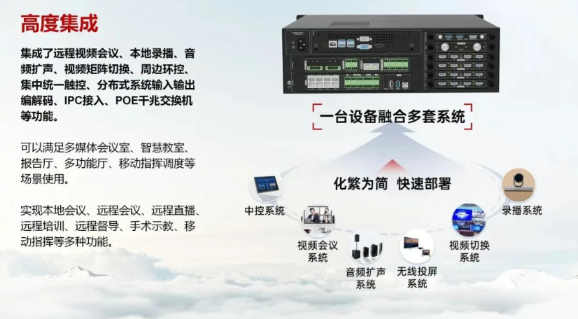 攀登者系列产品集成了远程视频会议、本地录播、音频扩声、视频矩阵切换、周边环控、集中统一触控、分布式系统输入输出编解码、IPC接入、POE千兆交换机等功能,可以满足多媒体会议室、智慧教室、报告厅、多功能厅、移动指挥调度等场景使用。实现本地会议、远程会议、远程直播、远程培训、远程督导、手术示教、移动指挥等多种功能。