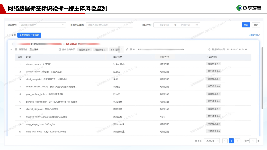 部署于数据发送方内部,实现跨主体交互数据识别、属性提取、动态标签生成,精准获取数据五元组、API、敏感程度、数据规模等信息,按标准生成包含10大核心字段的标准化动态标签,支持医疗、党政等行业重要数据、商业秘密、敏感个人信息的专属标识打标。