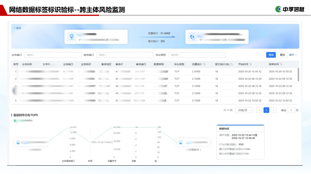 构建多维风险监测体系,生成数据量、跨主体目标、流动特征标签范围等多重基线,对异常数值实时告警;同时实现跨主体数据的分类统计与一致性核查;
