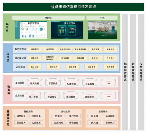 设备维修仿真模拟系统采用四层架构,构建培训全场景解决方案。展示层提供多终端协同,即学员通过VR端沉浸操作高精度设备模型,网页端灵活理论学习,教师端实时监控学习情况。应用层实现三端互通,形成“理论奠基→模拟实训→考核评估”链条。数据层整合设备知识资产,构建维保与故障指示库、学习档案库等,驱动精准教学。同时,依托VR串流技术等各项基础设施层支撑,确保超低延迟体验,并通过安全防护保障数据资产。该架构实现“教-学-练-评”闭环,突破传统培训时空限制,显著降低设备损耗与安全风险,赋能高效培养技术人才。