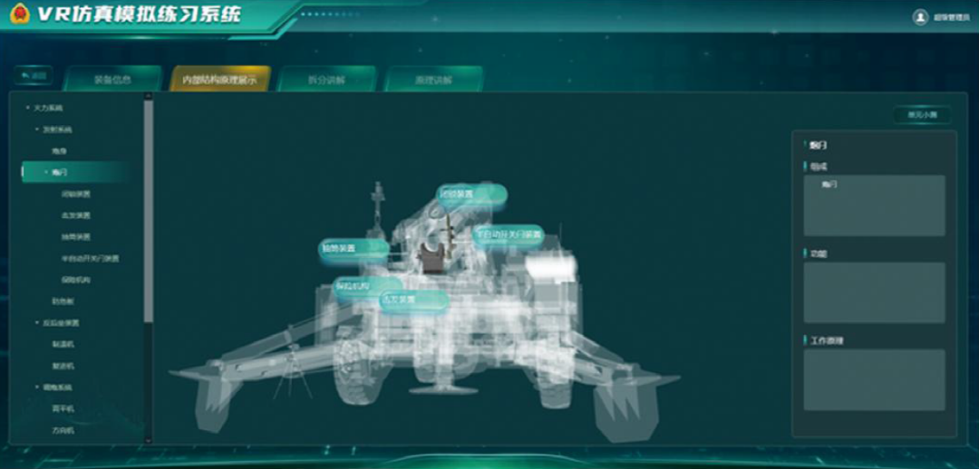 通过“系统-模块-构件”三级穿透式讲解,使学员清晰认知装备结构,利用VR手势交互对关键构件进行拆解、组装,结合网页端提供的3D爆炸图、名词解释等理论知识,双端协同让隐性知识显性化,实现装备培训零损耗、零风险、高效率。