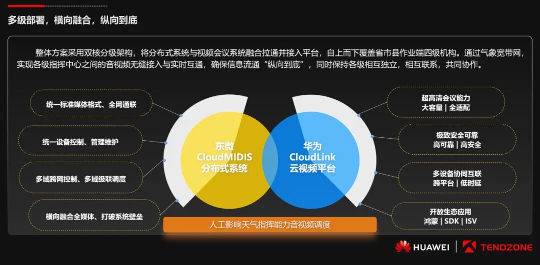 联合方案采用双核分级架构,将东微多媒体分布式交互系统(MIDIS)与华为CloudLink云视频平台深度融合,依托气象宽带网,实现省—市—县—作业端四级机构音视频信号的无缝接入与实时互通。