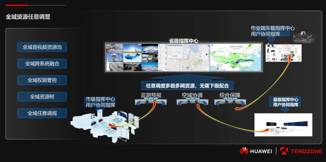 在横向维度,方案打破传统系统壁垒,融合视频会议、分布式显控、语音通信、监控系统、气象业务平台等,构建全域音视频资源池,实现任意资源调显、任意点对点连线、任意跨级协同。