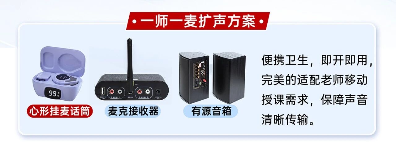 • 一师一麦方案:便携卫生,即开即用,完美适配老师移动授课需求,保障声音清晰传输。