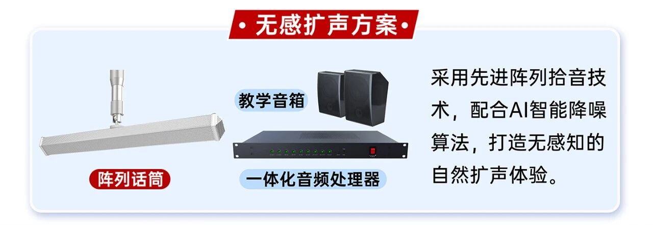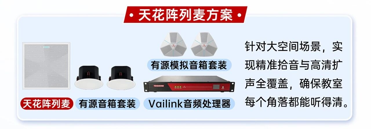 • 天花阵列麦方案:针对大空间场景,实现精准拾音与高清扩声全覆盖,确保教室每个角落都能听得清。