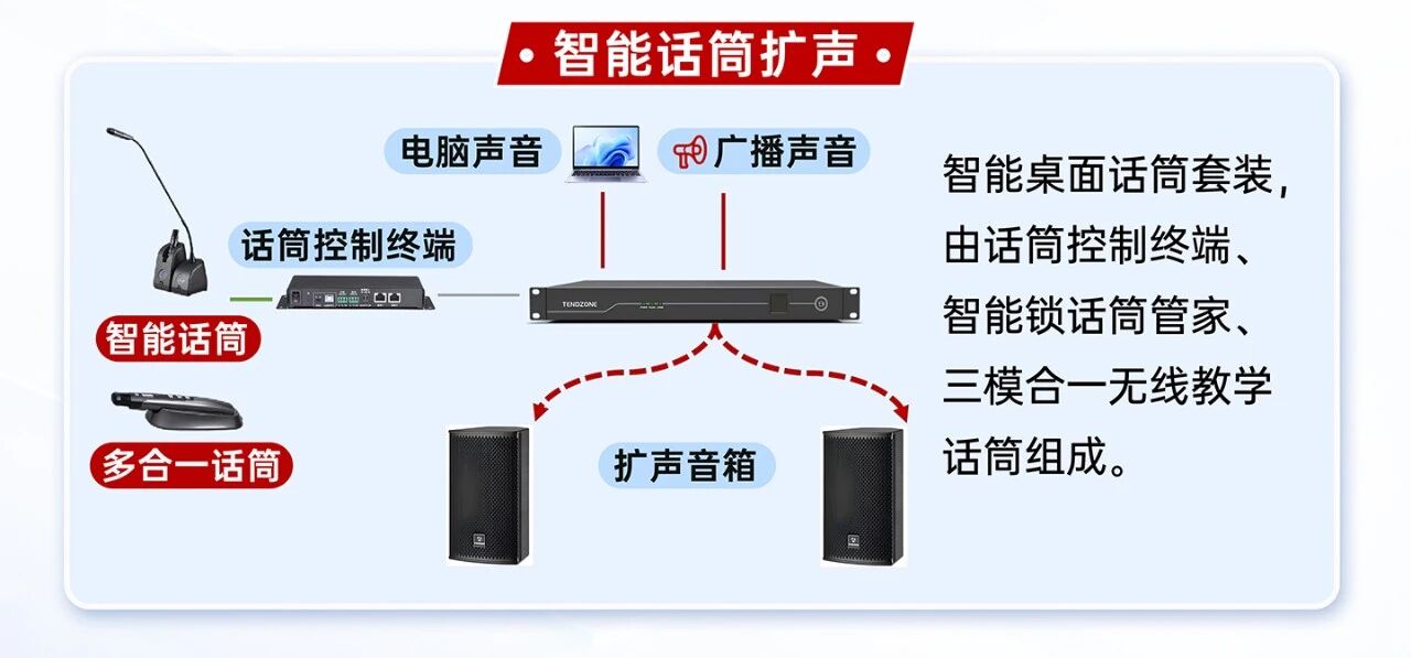 • 阶梯教室/合班课:均匀扩声、无啸叫、远距离清晰拾音、智能降噪