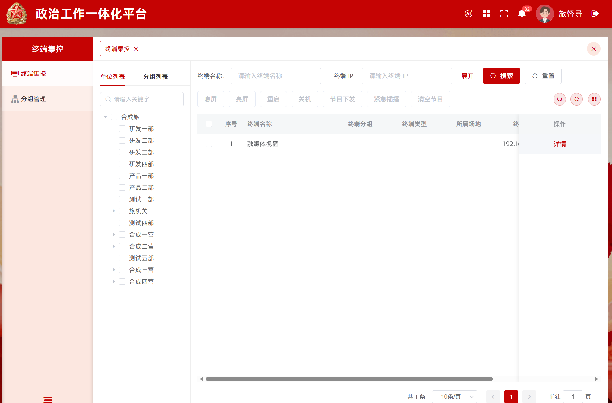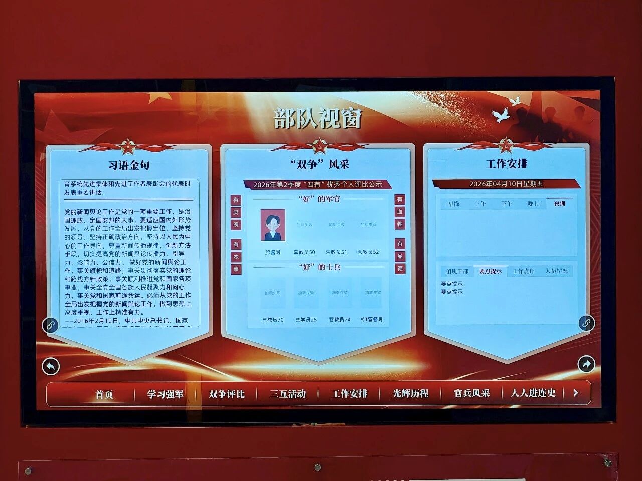 机关宣传干事登录平台后台,编辑内容,选择发布范围——全旅、某营、某连——点击发送。所有终端实时同步,无需人工干预。