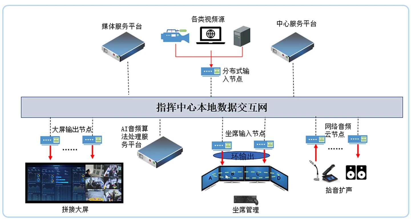 系统通过服务器+输入/输出节点架构,将12楼指挥调度大厅与13楼领导决策室内网连接一体,基于“云+边缘+接口”的物联网思维,兼容PKS+鲲鹏云安全生态,支持海量信号接入(含4K/8K),可同时处理数百路视频信号,兼容监控摄像机、视频会议、电脑等多种格式。所有音视频信号通过一个平台完成传输、调度、显示与设备统一管理,打破传统信息孤岛。