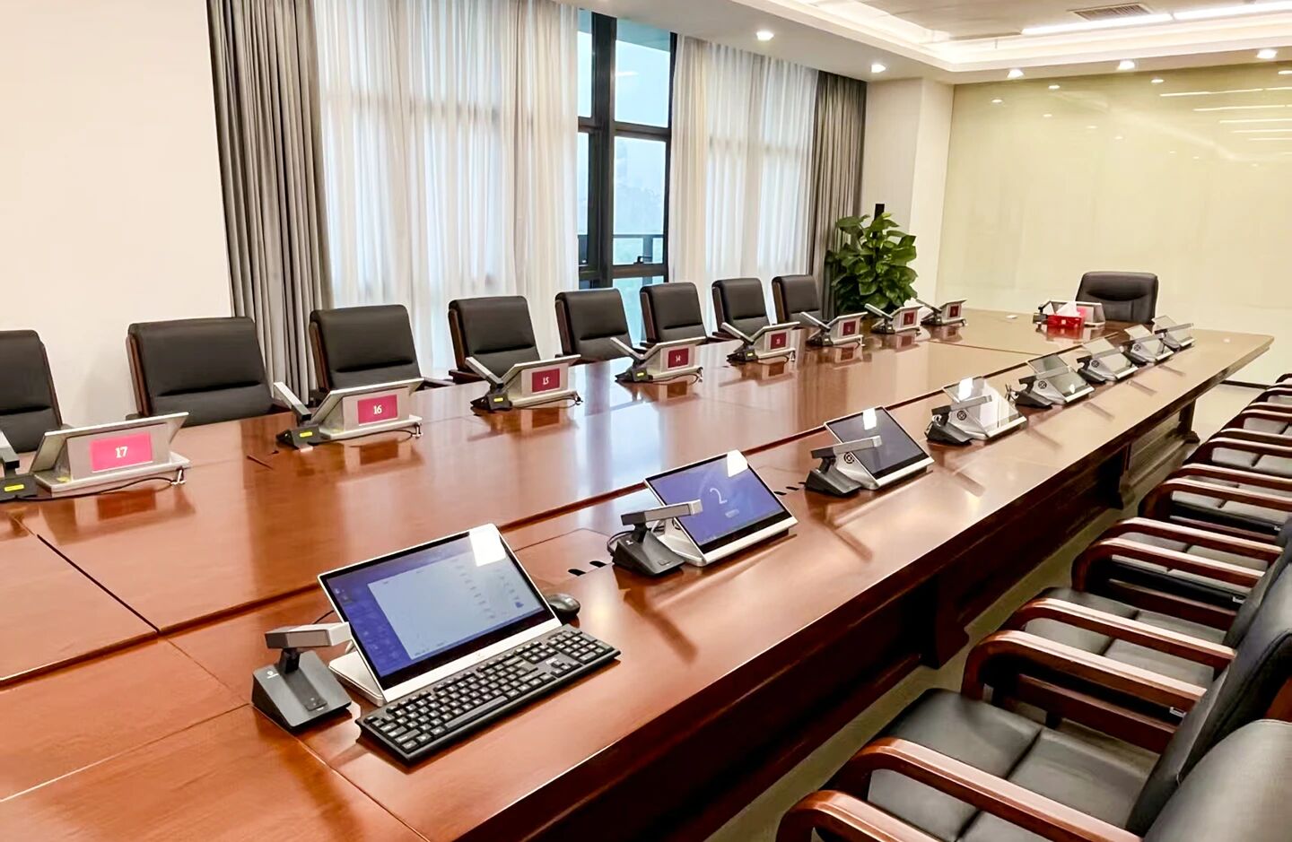 13楼领导决策室约138㎡,最佳观看距离对应98寸会议一体机,兼顾效果与造价。配套无纸化会议系统:16台智能终端+服务管理平台,实现一键签到、表决、同屏、批注、资料互动,免打印、不泄密、高效环保。同时配置数字会议双备份话筒,确保重要决策万无一失。